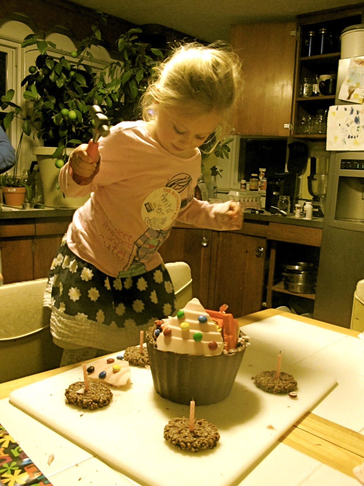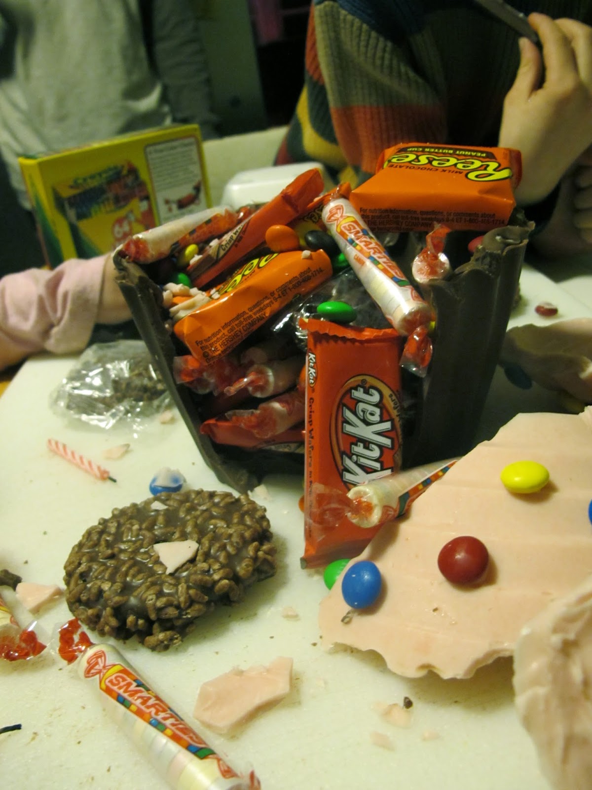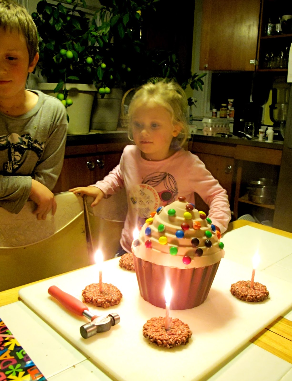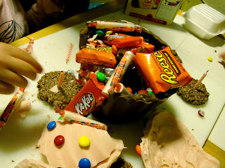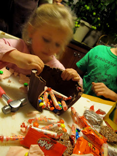 Cale made her a chocolate pinata filled with treats. It's basically a chocolate and white chocolate shell made in a silicone mold and then filled and "glued" together with more chocolate, but it was a lot of fun.