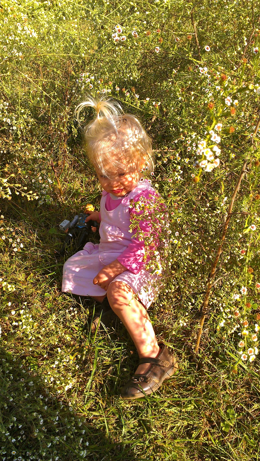 Annika in her house. The boys made her a castle out of weeds....she loves it.
